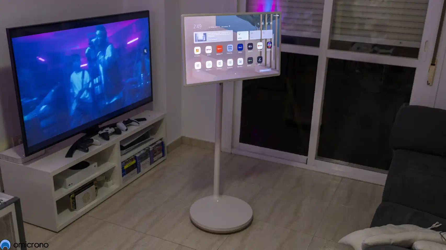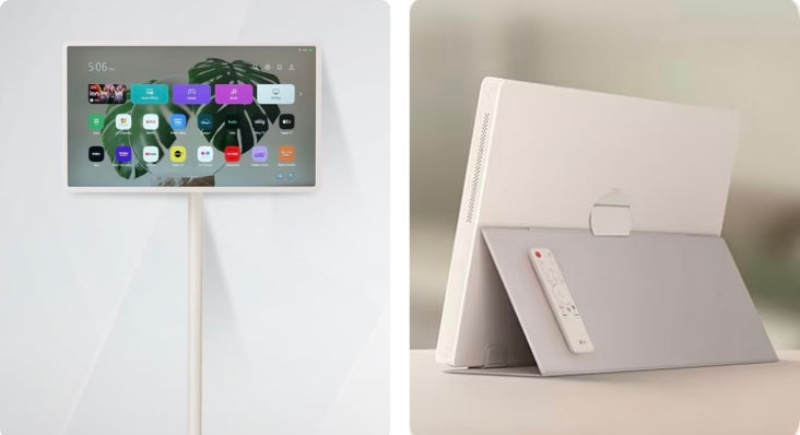 Roll the screen using the adjustable rolling stand. Detach it and place it on a piece of furniture like a tablet with the folio case.